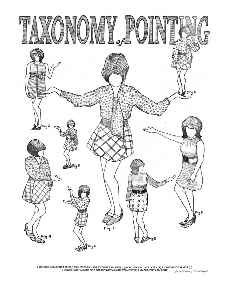 “This, That and the Other (Dreams of to-be-looked-at-ness) is a new exhibition of works by Jill Goldman that continues her practice of exploring memory and autobiography. The exhibit takes as its starting point the artist’s answer to the ubiquitous childhood question, “What do you want to be when you grow up?” Goldman remembers playing the 1960s board game What Shall I Be? The Exciting Game of Career Girls. Promoted as an “educational game for girls,” players learn how to perform femininity by collecting cards such as “you are pretty,” “neat,” “graceful,” and “have a nice smile” that maximize their chances to become one of the careers deemed gender appropriate: nurse, model, airline hostess, ballet dancer or actress. Cards such as “you are overweight,” “your make-up is too sloppy” and “you have poor posture” set the player back by sabotaging those career goals. Goldman’s childhood dream jobs were to be Carol Merrill, a tour guide at Graystone Mansion in Beverly Hills, and a backup dancer, careers that ostensibly adhere to the boardgame’s misogynist emphasis on prettiness, gracefulness and neatness. However, while these jobs embody what the feminist film theorist Laura Mulvey’s labels “to-be-looked-at-ness,” they also destabilize that sexist paradigm by redirecting the gaze. As the artist explains, Carol Merrill, the famously silent game show model on Let’s Make a Deal, is not merely a mute mannequin, a pretty female with a nice smile and good posture, but a subject with genuine agency. On television from 1963-1977—a period that encompasses the entirety of Goldman’s childhood—Merrill’s pointing gestures, like those of a tour guide and a backup dancer, tell us where to look and therefore subvert the pleasure or “scopophilia” that the male gaze takes in objectifying women. The female body is no longer a passive object to be ogled but an active force that demands attention so that it can point us in a new direction.